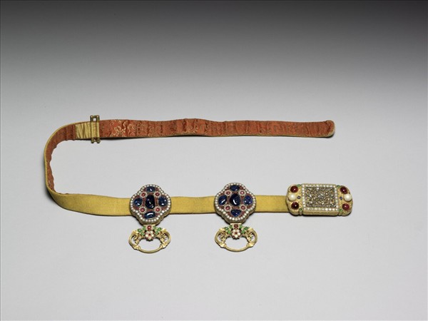 明黃縧帶,內裡襯以紅地雲龍紋織金錦。帶頭鑲嵌東珠及紅、藍、綠色珠石,托襯四圍珍珠環繞的晶燦花卉,屬皇帝禮服御用腰帶。