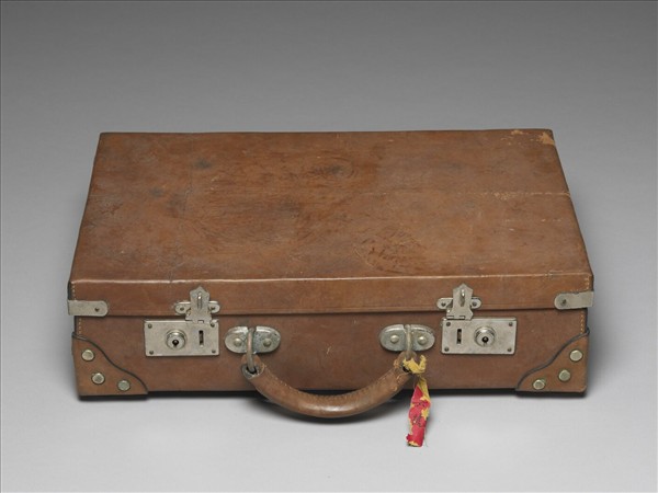 褐色長方形掀蓋式皮箱,半環形提把,側面以附鑰匙鎖的卡榫扣合,蓋外四角釘有金屬片做固定及補強之用,箱體底邊四角也以三角形皮片及鉚釘做補強,箱底中央及四角釘有較大的鉚釘,作為箱足,以避免放置時碰撞、摩擦箱體。箱內以土黃色皮為裡,箱蓋內側有一長方形內袋,可放置小或扁平的物品。