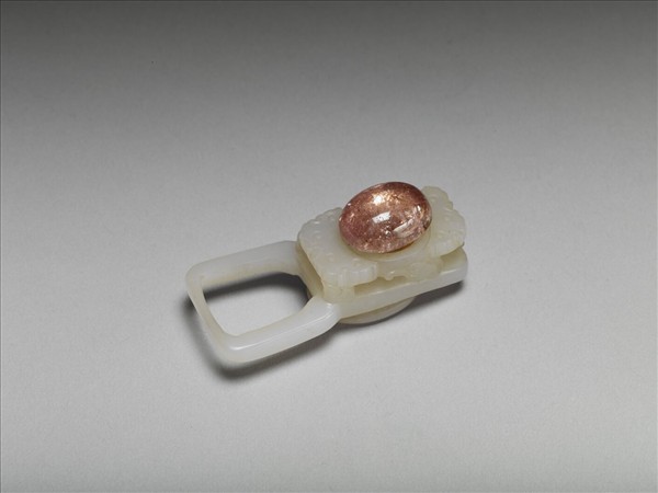 白玉帶扣,一側為方形帶孔,器上方雙側雕葉紋上刻小圈為飾,中央嵌一粉紅碧璽,側邊雕朵雲紋,餘地鏤空,背琢橢圓柱一。