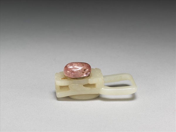 玉帶扣,一側為方形帶孔,器上方雙側雕葉紋上刻小圈為飾,中央嵌一粉紅碧璽,側邊雕朵雲紋,餘地鏤空,背琢橢圓柱一。