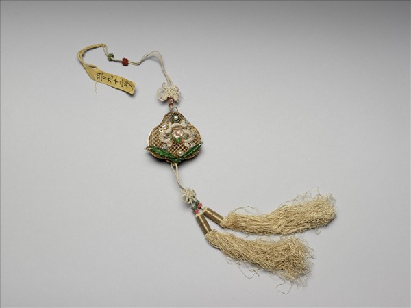 桃實形外廓,纍絲編綴錢紋,串盤長結與雙流蘇。雙面鑲嵌行龍雲氣紋,開合處襯以翠玉綠葉,珠翠寶石與鏤空底紋虛實交映,華美精緻。