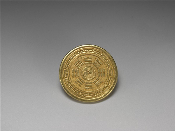 圓形金墜飾,正面中央飾太極八卦圖,周圍飾弦紋及回紋邊飾。背面中央有一環,作手握金環造型。環兩側各有「原金」、「義寶」兩個戳記。附錦袋一。