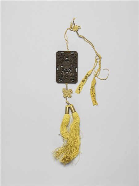 長方形茄楠木佩,鏤雕雙龍及蝙蝠捧壽,間飾以卷雲紋,上下端繫黃縧,並飾結子及流蘇。