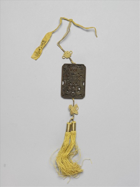 長方形茄楠木佩,鏤雕雙龍及蝙蝠捧壽,間飾以卷雲紋,上下端繫黃縧,並飾結子及流蘇。