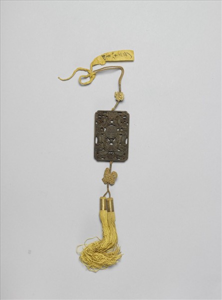 長方形茄楠木珮,鏤雕雙龍及蝙蝠捧壽,間飾以卷雲紋,上下端繫黃縧,並飾結子及流蘇。