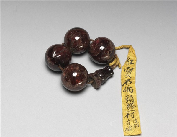 紅色寶石佛頭珠及佛頭塔一組,佛頭珠四顆,佛頭塔一個,為製作朝珠或數珠的備用零件。