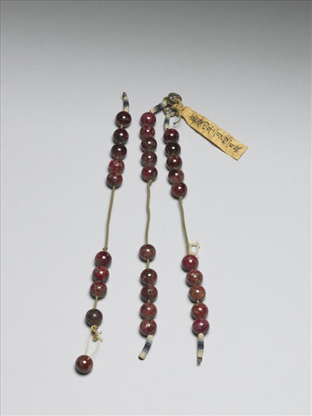 紅玻璃珠三串,一串十顆,共計三十顆,以黃縧串成朝珠或數珠上面懸掛的記捻形式,珠串上下以米珠與組帶裝飾,為製作記捻用的備用零件。在清宮中與故雜3382共同收藏。