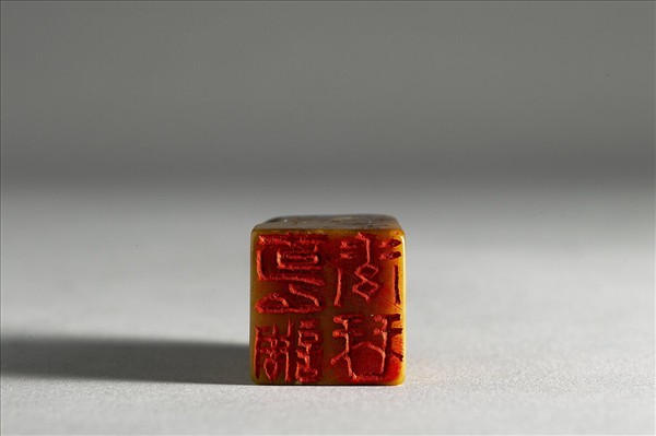 石章,印面正方,色蜜黃有棕色斑紋。全套共十二件,為集刻劉禹錫〈陋室銘〉。本件陰刻「可以調素琴」。邊款「可以調素琴。三橋。松泉居士鑑賞于香樹先生齋中」。作者傳為明代書篆大家文彭(1498-1573)。全套收於一木屜,附清乾隆〈銘篆兼珍〉印譜。
