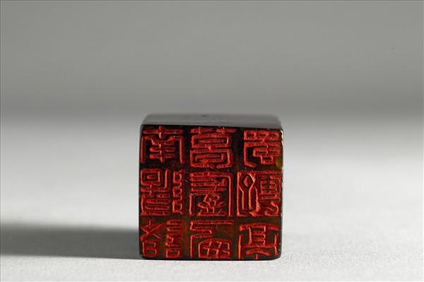 石章,印面正方,色純黑。全套共十二件,為集刻劉禹錫〈陋室銘〉。本件陰刻「南陽諸葛廬西蜀子雲亭」。邊款「南陽諸葛廬西蜀子雲亭」。作者傳為明代書篆大家文彭(1498-1573)。全套收於一木屜,附清乾隆〈銘篆兼珍〉印譜。