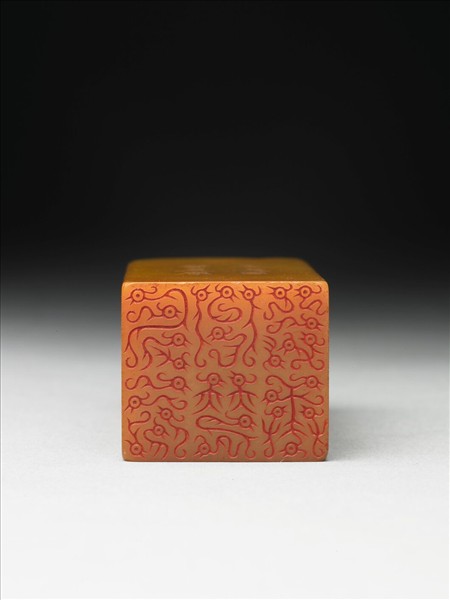 壽山石章,印面正方,色黃。此印蓋屬「璿璣仙藻」套印中的其中一方,整套印共八十四方。該套印上冊均先將「長祥康崇慶享豐明昌」九字順次排成三直行,使成正方形九宮格狀,再依照邊款所揭示之規則、字體刻為印文。此印即如邊款「龍書,太昊時獲景龍之瑞,因作此書」、「斜順文二句」所述,印面採太昊所創「龍書」,陰刻斜順文「長慶昌豐慶康」六字。