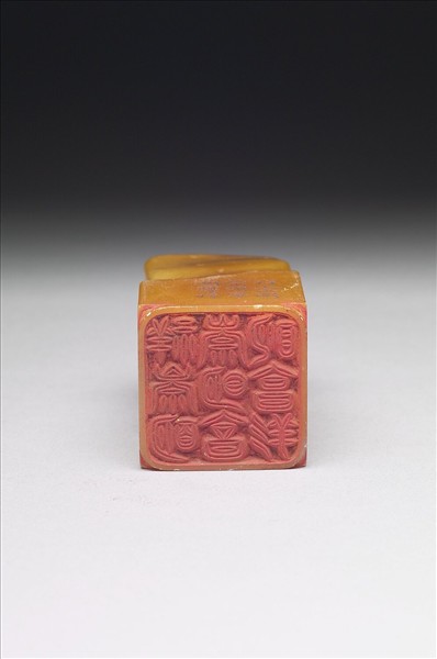 壽山石章,印面正方,色黃。此印蓋屬「璿璣仙藻」套印中的其中一方,整套印共八十四方。該套印上冊均先將「長祥康崇慶享豐明昌」九字順次排成三直行,使成正方形九宮格狀,再依照邊款所揭示之規則、字體刻為印文。此印即如邊款「刻符篆,秦壞古文,更定八體,此其一也」、「四隅順文三句」所述,印面採秦代所創「刻符篆」,陽刻四隅順文「祥崇明崇明享明享祥」九字。