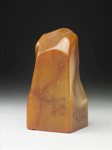 壽山石章,印面正方,色黃。此印蓋屬「璿璣仙藻」套印中的其中一方,整套印共八十四方。該套印上冊均先將「長祥康崇慶享豐明昌」九字順次排成三直行,使成正方形九宮格狀,再依照邊款所揭示之規則、字體刻為印文。此印即如邊款「飛白書,漢蔡邕見人以帚成字而作此」、「四隅迴文三句」所述,印面採漢蔡邕所創「飛白書」,陽刻四隅迴文「祥享明享明崇明崇祥」九字。