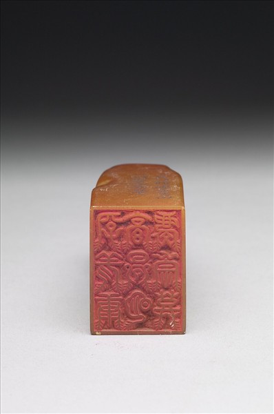 壽山石章,印面正方,色黃。此印蓋屬「璿璣仙藻」套印中的其中一方,整套印共八十四方。該套印上冊均先將「長祥康崇慶享豐明昌」九字順次排成三直行,使成正方形九宮格狀,再依照邊款所揭示之規則、字體刻為印文。此印即如邊款「垂雲篆,黃帝時因慶雲見,遂作此體」、「上左角盤迴文三句」所述,印面採黃帝所創「垂雲篆」,陽刻上左角盤迴文「長祥康享昌明慶崇豐」九字。