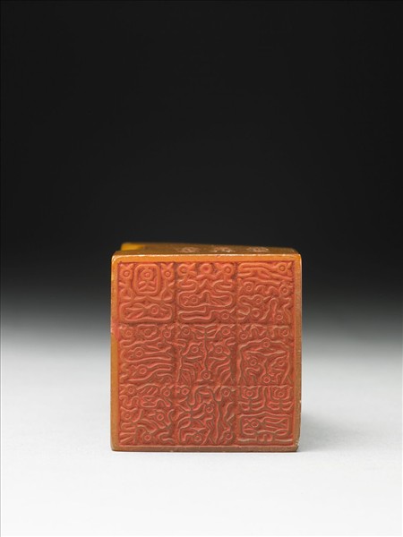 壽山石章,印面正方,色黃。此印蓋屬「璿璣仙藻」套印中的其中一方,整套印共八十四方。該套印上冊均先將「長祥康崇慶享豐明昌」九字順次排成三直行,使成正方形九宮格狀,再依照邊款所揭示之規則、字體刻為印文。此印即如邊款「秦璽篆,秦李斯所作,此仿永昌玉印文體」、「下左角盤順文三句」所述,印面採秦李斯所創「秦璽篆」,陽刻下左角盤順文「昌明慶享康祥長崇豐」九字。