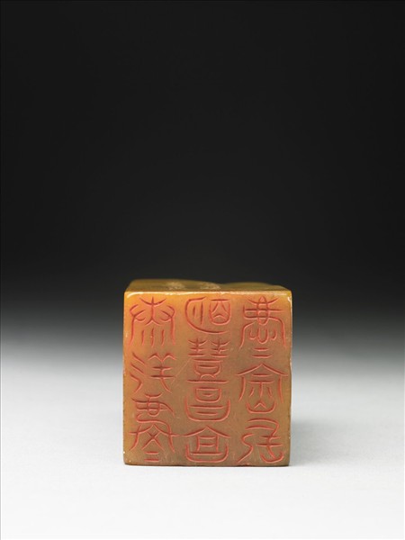 壽山石章,印面正方,色黃 。此印蓋屬「璿璣仙藻」套印中的其中一方,整套印共八十四方。該套印上冊均先將「長祥康崇慶享豐明昌」九字順次排成三直行,使成正方形九宮格狀,再依照邊款所揭示之規則、字體刻為印文。此印即如邊款「柳葉篆,晉衛瓘三世攻書,善眾體,又為此法」、「卍字迴文四句」所述,印面採晉衛瓘所創「柳葉篆」,陰刻卍字迴文「康祥慶慶明豐昌享慶慶崇長」十二字。