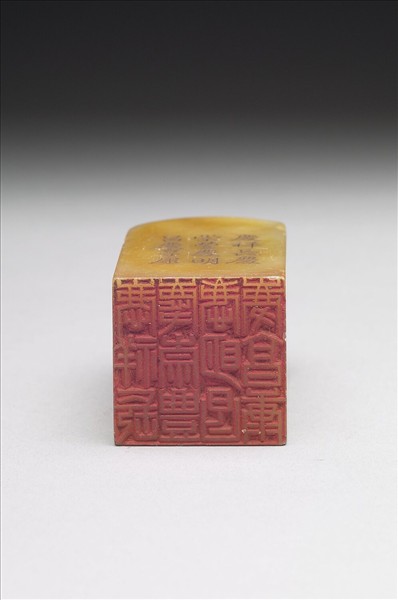 壽山石章,印面正方,色黃。此印蓋屬「璿璣仙藻」套印中的其中一方,整套印共八十四方。該套印上冊均先將「長祥康崇慶享豐明昌」九字順次排成三直行,使成正方形九宮格狀,再依照邊款所揭示之規則、字體刻為印文。此印即如邊款「懸針篆,漢曹喜作,後人以此題五經篇目」、「卍字又一體順文四句」所述,印面採漢曹喜所創「懸針篆」,陽刻卍字又一體順文「慶祥長慶崇豐慶明昌慶享康」十二字。