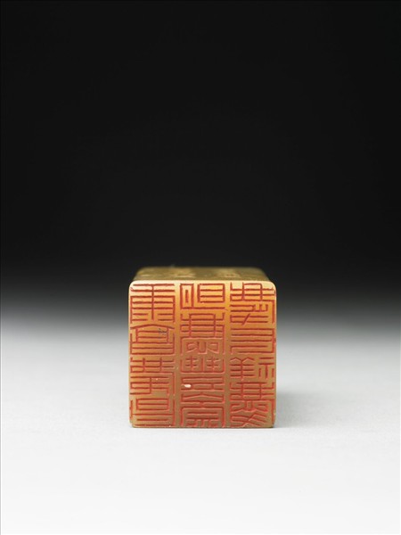 壽山石章,印面正方,色黃。此印蓋屬「璿璣仙藻」套印中的其中一方,整套印共八十四方。該套印上冊均先將「長祥康崇慶享豐明昌」九字順次排成三直行,使成正方形九宮格狀,再依照邊款所揭示之規則、字體刻為印文。此印即如邊款「漢印篆,漢高祖時仿秦繆篆而為之」、「卍字又一體迴文四句」所述,印面採「漢印篆」,陰刻卍字又一體迴文「康享慶昌明慶豐崇慶長祥慶」十二字。