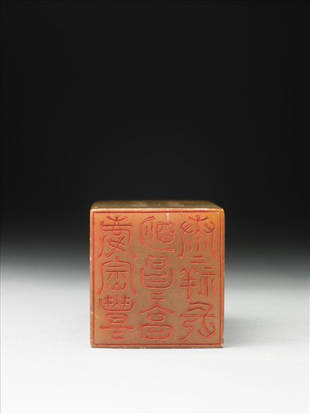 壽山石章,印面正方,色黃。此印蓋屬「璿璣仙藻」套印中的其中一方,整套印共八十四方。該套印上冊均先將「長祥康崇慶享豐明昌」九字順次排成三直行,使成正方形九宮格狀,再依照邊款所揭示之規則、字體刻為印文。此印即如邊款「草篆,明趙宧光作,蓋原天璽碑而小變焉」、「右蟬聯迴文四句」所述,印面採明趙宧光所創「草篆」,陰刻右蟬聯迴文「慶崇豐豐明昌昌享康康祥長」十二字。