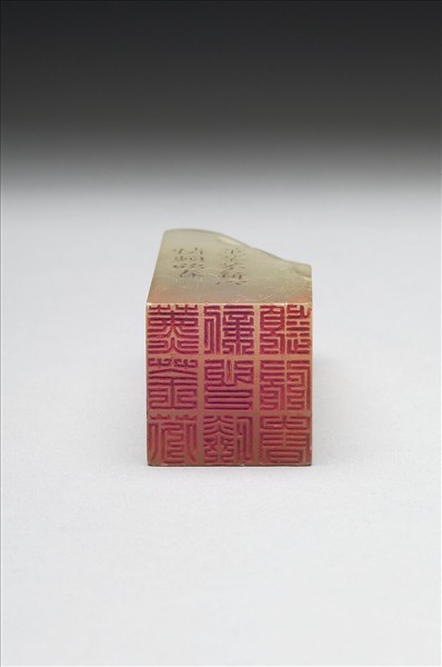 壽山石章,印面正方,色白。此印蓋屬「璿璣仙藻」套印中的其中一方,整套印共八十四方。該套印下冊均先將「薰荃芬憐心新頻欣春」九字順次排成三直行,使成正方形九宮格狀,再依照邊款所揭示之規則、字體刻為印文。此印即如邊款「尚方大篆,秦程邈所述,後人飾之以為法」、「右縱三疊順文三句」所述,印面採秦程邈所創「尚方大篆」,陰刻右縱三疊順文「薰荃芬新心憐頻欣春」九字。