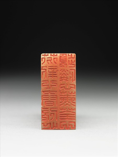 壽山石章,印面正方,色白。此印蓋屬「璿璣仙藻」套印中的其中一方,整套印共八十四方。該套印下冊均先將「薰荃芬憐心新頻欣春」九字順次排成三直行,使成正方形九宮格狀,再依照邊款所揭示之規則、字體刻為印文。此印即如邊款「漢印篆,漢高祖時仿秦繆篆而為之」、「卍字又一體迴文四句」所述,印面採「漢印篆」,陰刻卍字又一體迴文「芬新心春欣心頻憐心薰荃心」十二字。