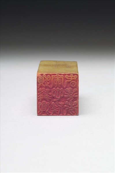 壽山石章,印面正方,色白。此印蓋屬「璿璣仙藻」套印中的其中一方,整套印共八十四方。該套印下冊均先將「薰荃芬憐心新頻欣春」九字順次排成三直行,使成正方形九宮格狀,再依照邊款所揭示之規則、字體刻為印文。此印即如邊款「轉宿篆,宋司馬因熒惑退舍而作此」、「左橫三疊順文三句」所述,印面採宋司馬所創「轉宿篆」,陽刻左橫三疊順文「頻憐薰荃心欣春新芬」九字。
