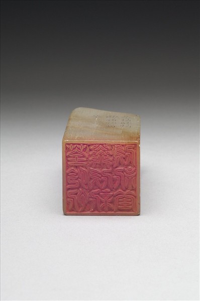壽山石章,印面正方,色白。此印蓋屬「璿璣仙藻」套印中的其中一方,整套印共八十四方。該套印下冊均先將「薰荃芬憐心新頻欣春」九字順次排成三直行,使成正方形九宮格狀,再依照邊款所揭示之規則、字體刻為印文。此印即如邊款「四隅順文三句」、「刻符篆,秦壞古文,更定八體,此其一也」所述,印面採秦代所創「刻符篆」,陽刻四隅順文「荃憐欣憐欣新欣新荃」九字。