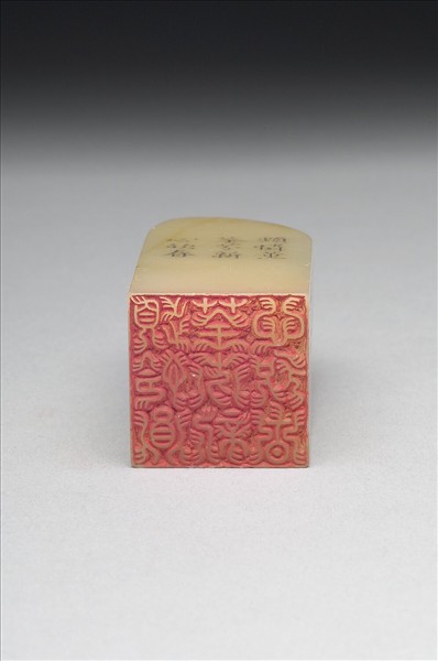 壽山石章,印面正方,色白。此印蓋屬「璿璣仙藻」套印中的其中一方,整套印共八十四方。該套印下冊均先將「薰荃芬憐心新頻欣春」九字順次排成三直行,使成正方形九宮格狀,再依照邊款所揭示之規則、字體刻為印文。此印即如邊款「下左角盤迴文三句」、「龍爪篆,晉王右軍所作,形如龍爪也」所述,印面採晉王右軍所創「龍爪篆」,陽刻下左角盤迴文「頻憐薰荃芬新心欣春」九字。