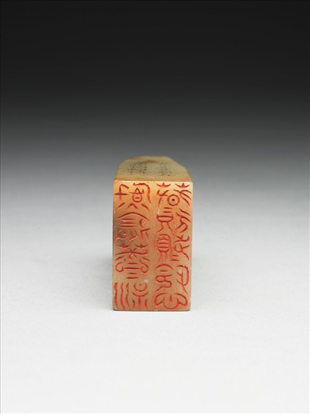 壽山石章,印面正方,色白。此印蓋屬「璿璣仙藻」套印中的其中一方,整套印共八十四方。該套印下冊均先將「薰荃芬憐心新頻欣春」九字順次排成三直行,使成正方形九宮格狀,再依照邊款所揭示之規則、字體刻為印文。此印即如邊款「右蟬聯順文四句」、「古文,亦皇帝史倉頡之所作也」所述,印面採皇帝史倉頡所創「古文」,陰刻右蟬聯順文「薰荃芬芬新春春欣頻頻憐心」十二字。
