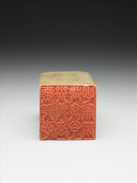壽山石章,印面正方,色白。此印蓋屬「璿璣仙藻」套印中的其中一方,整套印共八十四方。該套印下冊均先將「薰荃芬憐心新頻欣春」九字順次排成三直行,使成正方形九宮格狀,再依照邊款所揭示之規則、字體刻為印文。此印即如邊款「卐字順文四句」、「倒薤篆,商代仙人務光見薤葉偃風象為此書」所述,印面採商代仙人務光所創「倒薤篆」,陽刻卍字順文「薰憐心心新春頻欣心心荃芬」十二字。