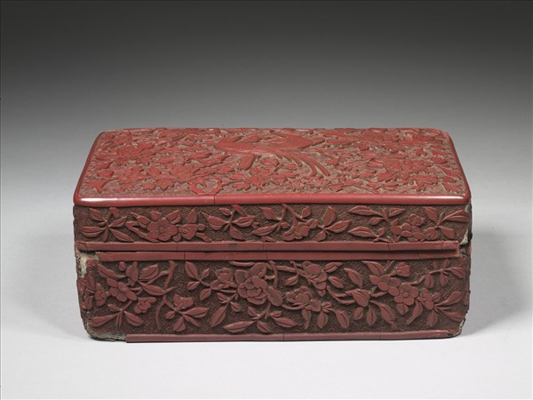 長方形,平底,髹黑漆,盒內清宮存放〈愛蓮說〉套印。盒側面作折枝茶花與梅花,茶花枝幹由左下角伸入,向下彎轉,梅幹則是從左下進入後,往上延伸,並與盒蓋的枝葉相連,另一面枝由上方進入畫面後,往下及右下延伸,花葉扶疏,十分宜人。盒蓋牡丹從偏左下方長出,到中心後往右方伸展,盒蓋中央的枝幹上棲息著兩隻長尾鳥,互相迴首對視,牡丹盛開,花與鳥的姿態均優雅美麗,花葉的佈置從容不迫,漆盒均先滿鋪花格錦地,漆色紅潤,漆層薄而不堅,枝葉少重疊,刀法純熟,表面打磨光滑,平實婉約。