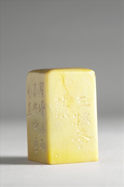 十一件印章(故雜3497-故雜3507),原共盛於剔紅漆盒內,石色各不同,均屬青田石系。各以不同字體,聯文為周敦頤〈愛蓮說〉全文。邊款各有與印文相同的行草文,又分刻「壽承氏印」、「文彭仿古」、「三橋學篆」、「三橋」、「文彭」、「文彭篆」、「嘉靖九年(1530),歲次庚寅,春王正月既望,作于徐氏之東雅堂。長洲文彭。」「周頤公之文為最,而三橋之篆又稱古健,得此印全副,摩挲竟月,不知門外軟紅塵十丈也,因援筆記之。陳維崧。」「勵杜訥同觀」、「鄂善書記」、「半畝龔賢」、「余見廣文之印,曷止數百枚,求全文則十無一全,今得此十一枚,乃所作〈愛蓮說〉一篇,未闕一枚,因裝成一篋,時時觀玩,是以識之。七十四叟理齋藏寶」等字樣。原漆盒內猶有乾隆四十九年(1784)御題時句。本組印章的印文可相連成一篇文章,亦係閒章的一種。傳世及著錄的文彭印章,少見有聯文者,唯乾隆御製時文集中所見清宮收藏的文彭聯文印卻有十組左右。本組〈愛蓮說〉聯文印以北宋周敦頤的一篇膾炙人口的文章為主題,並有陳維崧(1626-1682)、勵杜訥(1628-1703)、龔賢(1619-1689)、鄂善、葛元煦等清代收藏家款字,但印文與邊款均與文氏風格略異,年款亦存疑。