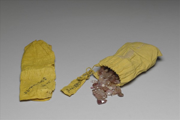 粉色碧璽石料一批,包裝在黃布袋中。