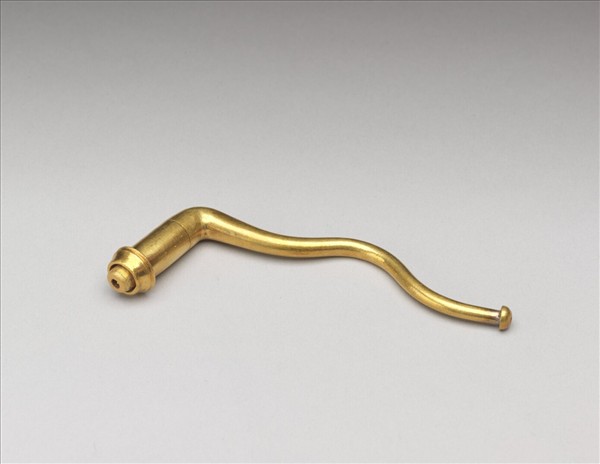 金煙嘴,略成L形,長管柄作波狀彎弧,末端直角彎曲後上伸為煙筒狀。就口處作半圓釦狀,便於吸用,但未見使用痕。整器金屬光澤亮眼,頗具富貴之氣。