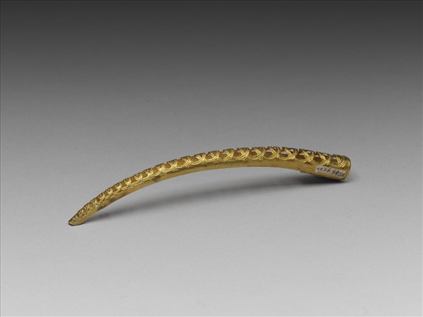 弓形,自基至指尖漸細,面作連環紋,並飾連珠紋地,基背包合而可伸縮,內刻「內廉陞足金重九□二分」。背作空格式。本器一式兩件成對。(故雜3582-3583)