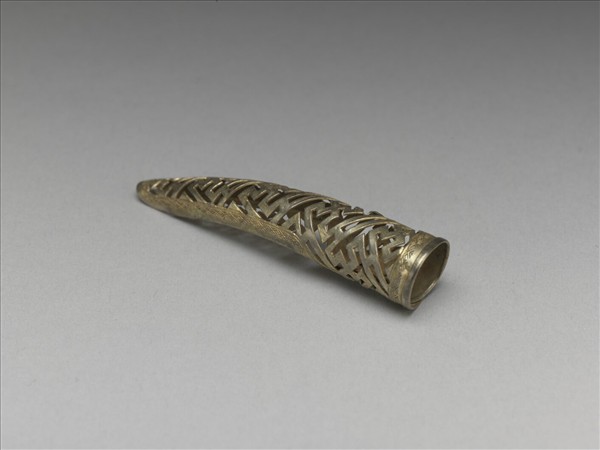 鍍金弓形指甲套,自基底至指間漸細,正面整體鏤空為卍字不斷紋錦地。套背部分未完全封閉,長梯形面上鏤空卍字紋,紋飾與器外壁同調。背基包合可伸縮。本器一式兩件成對。(故雜3588-3589)
