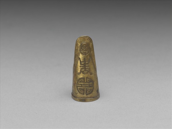 鍍金弓形指甲套,自基底至指間漸細,整體短而近三角椎狀。邊廓鏨飾回紋,正面以壽字及團壽字為飾,壽字線條為連珠紋組成。套背部分未完全封閉。背基包合可伸縮。本器一式兩件成對。(故雜3600-3601)