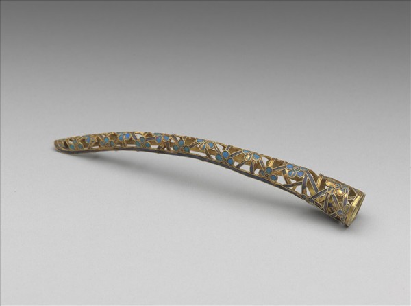 鍍金弓形指甲套,自基底至指間漸細。正面飾點翠鏤空冰梅紋。套背部分未完全封閉,作長橫格。背基包合可伸縮。本器一式兩件成對。(故雜3604-3605)