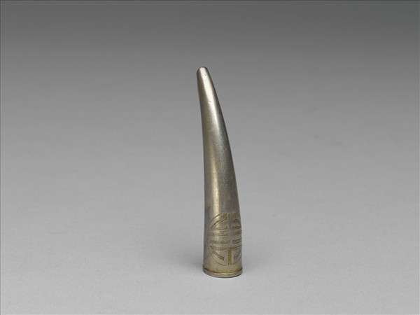 金屬弓形指甲套,自基底至指間漸細,外壁光素,僅在底部鏨飾團壽。套背部分未完全封閉,露出部份空洞,背基包合可伸縮。本器一式兩件成對。(故雜3608-3609)