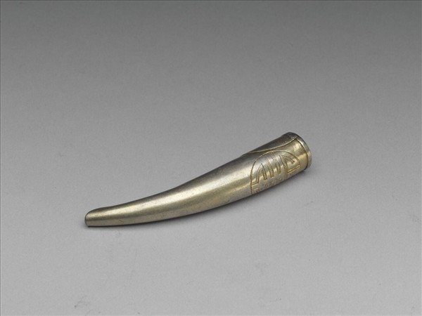 金屬弓形指甲套,自基底至指間漸細,外壁光素,僅在底部鏨飾團壽。套背部分未完全封閉,露出部份空洞,背基包合可伸縮。本器一式兩件成對。(故雜3608-3609)