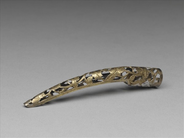 鍍金弓形指甲套,自基底至指間漸細。正面飾鏤空連枝芙蓉花葉,花葉皆平鋪伸展,配合扭轉的枝梗。套背部分未完全封閉,鏨刻卷枝花葉為飾。背基包合可伸縮。本器一式兩件成對。(故雜3610-3611)