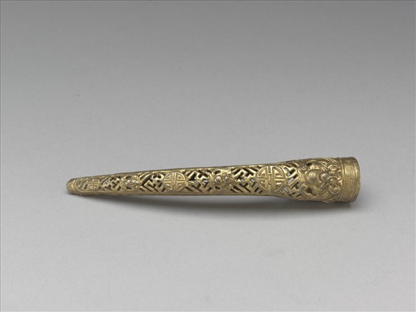 鍍金弓形指甲套,自基底至指間漸細。邊廓鏨飾回紋,外壁飾卍字錦地團壽蝙蝠紋,團壽與蝙蝠等距相間,並有「福壽」之吉祥意涵。套背部分未完全封閉,鏨刻卷枝花葉為飾。背基包合可伸縮。本器一式兩件成對。(故雜3612-3613)