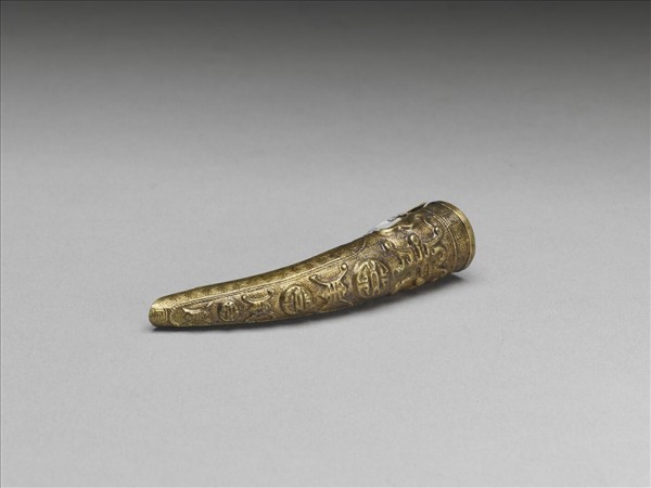 弓形,銀鍍金質,面部錘鍱出排列交錯之長壽與團壽字,往指尖字樣漸小;魚子紋地,器緣飾回紋;背部中段處亦鏤刻壽字紋,底部為左右兩側交疊而成,上錘鍱綬帶紋;此器與故雜3616為一對。