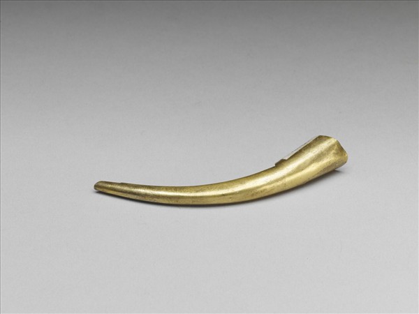 弓形,整器呈金色,由基底往指尖漸細,面無紋飾,背作萬字不斷紋,底部為兩側交疊而成,可調整大小。此器與故雜3619為一對。