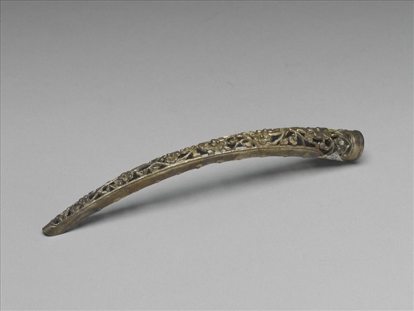 弓形,銀質鍍金,面部為鏤空連枝梅花,背作橫格式,底部為左右兩側交疊而成,可調整大小。此器與故雜3625為一對。