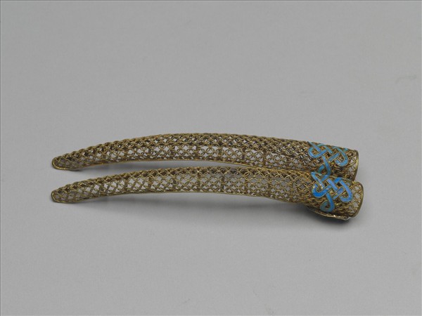 弓形,鍍金質,整器為相連古錢紋錦地,底部以點翠盤長紋為飾,背作橫格式,底部為左右兩側交疊而成,可調整大小。此器與故雜3627為一對。