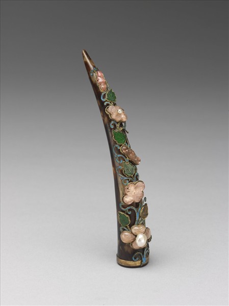 清代中晚期皇室貴族婦女多於指尖蓄長甲展現玉指葱秀之美,並以各式指甲套護指裝飾。金、銀、玳瑁等製成之尖錐形套管,或纍絲鏤空,或鏨刻鑲嵌,呈現精緻靈巧的工藝製作,指端風華,琳瑯多采。此玳瑁指甲套(故雜3630~3631),鍍金座上鑲粉紅碧璽葵花、翠玉葉及點翠纏枝;背鏤雕古錢紋兩組。