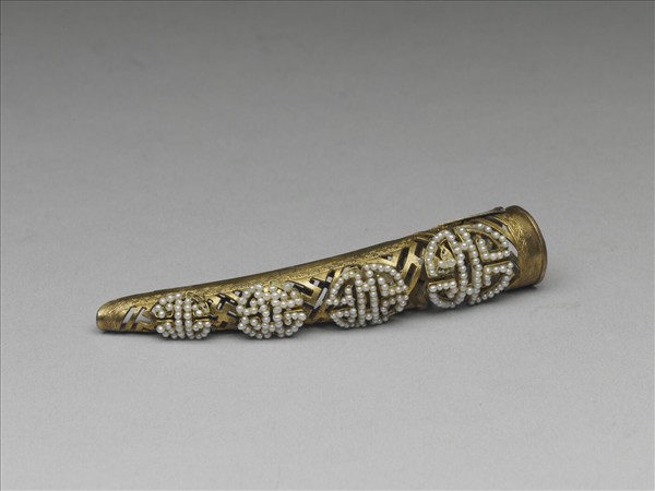 弓形,銅鍍金質,整器為鏤空萬字紋錦地,外圈飾格紋,面飾四個緝米珠團壽紋,由基部往指尖依序排列漸小;底部為兩側交疊而成,可調整套圍;指尖背部有開口。此器與故雜3635為一對。