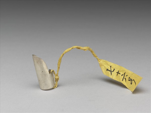 銀質指甲套,面部有如一片指甲,素面無紋,底部為兩側交疊而成,套圍可調整。此器與故雜3637為一對。