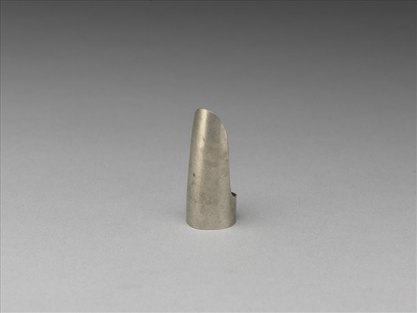 銀質指甲套,面部有如一片指甲,素面無紋,底部為兩側交疊而成,套圍可調整。此器與故雜3636為一對。