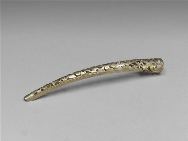 銀質弓形,由基部往指尖漸細,面部為鏤空連枝牡丹花葉紋,並以陰線刻與魚子紋表現花卉細部;背作橫格式,底部為兩側交疊而成,套圍可調整。此器與故雜3639為一對。